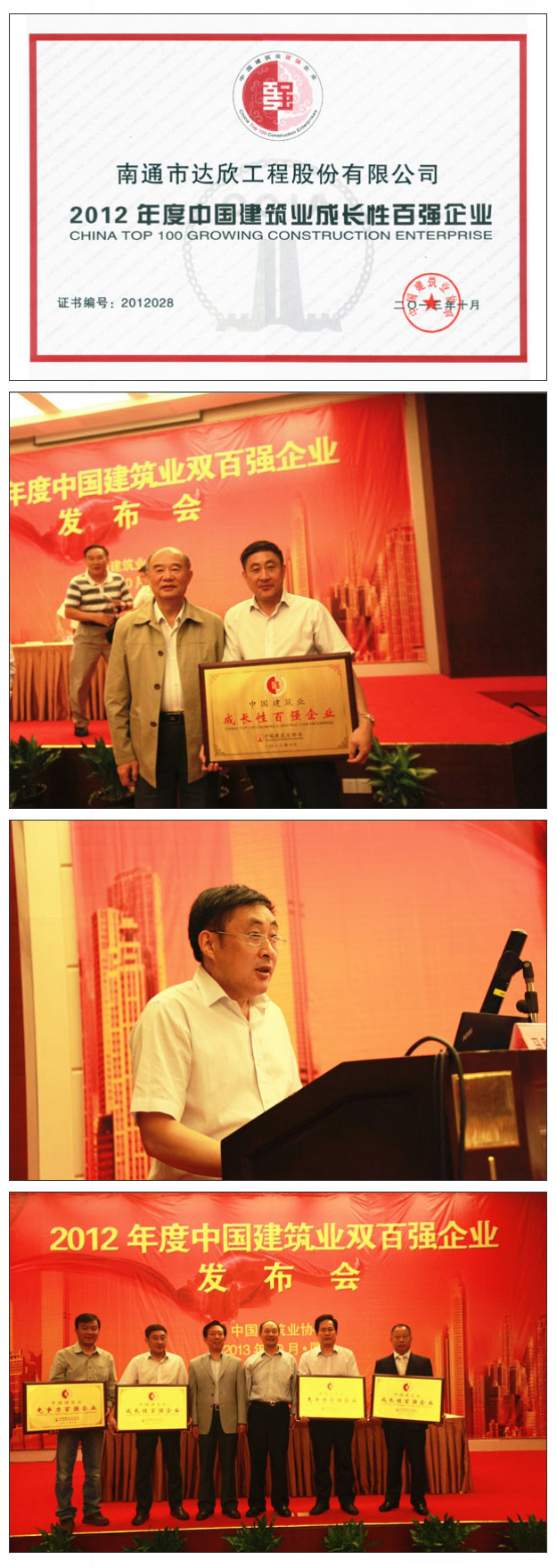 會議發(fā)布了2012年度中國建筑業(yè)雙百強企業(yè),南通市達欣工程股份有限公司再次入選成長性百強企業(yè)(綜合排名位列第28名,比去年排名提高了21位);會議向2012年度中國建筑業(yè)雙百強企業(yè)頒發(fā)牌證,我公司作為獲獎企業(yè)代表上臺領取獎牌;會議還同時進行了中國建筑業(yè)雙百強企業(yè)代表經(jīng)驗交流,公司董事長馬和軍作為江蘇地區(qū)代表、作為成長性百強企業(yè)代表在會上作了“砥礪奮進,拼搏進取,實現(xiàn)企業(yè)新跨越”的經(jīng)驗交流。
