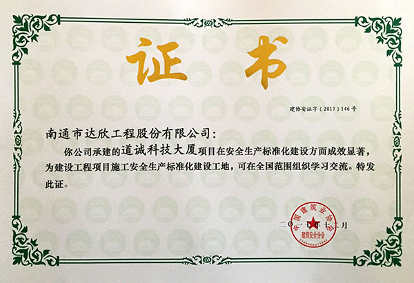近幾年,我公司獲得全國AAA級安全文明標(biāo)準(zhǔn)化工地25項(xiàng),創(chuàng)建面涉及上海、江蘇、河北、黑龍江、湖南、新疆等市場,榮譽(yù)的取得為進(jìn)一步提升“達(dá)欣”在全國各個(gè)市場的影響力,促進(jìn)企業(yè)健康發(fā)展奠定堅(jiān)實(shí)的品牌基礎(chǔ)。