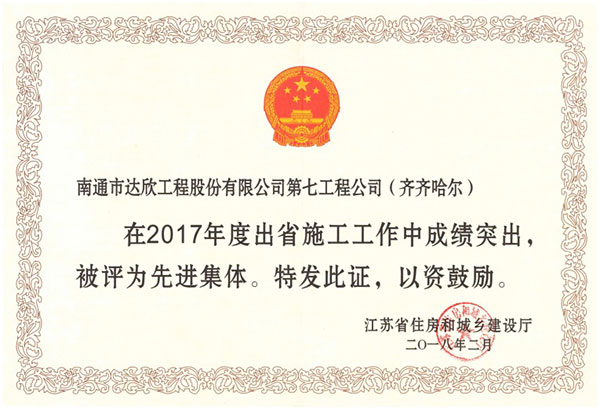 會議由江蘇省建設(shè)廳駐東北辦主任孫忠健主持,會議總結(jié)了2017年的工作,部署2018年工作任務(wù);會議表彰我省2017年進(jìn)東北建筑施工先進(jìn)集體和先進(jìn)個人,第七工程公司被授予“江蘇省出省建筑施工先進(jìn)集體”、陳貴榮同志被評為先進(jìn)個人。