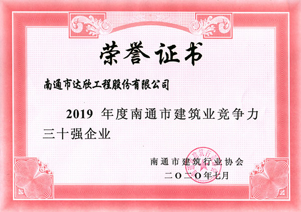 根據(jù)《關(guān)于開展2019年度南通市建筑業(yè)“雙三十強(qiáng)”及“三優(yōu)”評價(jià)工作的通知》(通建協(xié)〔2020〕2號),經(jīng)評審委員會對“雙三十強(qiáng)”企業(yè)及“三優(yōu)”初審結(jié)果進(jìn)行復(fù)核、審查,最終公司獲得2019年度南通市建筑業(yè)競爭力三十強(qiáng)企業(yè),評價(jià)排名第11位,馬和軍同志獲得南通市建筑業(yè)優(yōu)秀企業(yè)家,楊靜同志獲得南通市建筑業(yè)優(yōu)秀企業(yè)經(jīng)理。