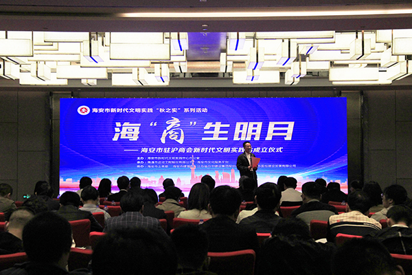 10月29日,海安市駐滬新時代文明實踐站成立儀式在上海舉行。江蘇省住建廳駐上海辦事處主任、江蘇省人民政府駐上海辦事處建管處處長趙永強,南通市文明辦副主任吳信林;海安市委副書記、黨校校長張浩,海安市委常委、宣傳部長王榮貴,海安市人民政府副市長戴曉晨,以及上海海安商會全體會員,海安駐滬流動黨員聯(lián)合黨委全體班子成員,海安駐滬建筑企業(yè)負責(zé)人,各區(qū)鎮(zhèn)街道政工書記、宣傳委員、駐滬招商人員等200多人出席活動現(xiàn)場。