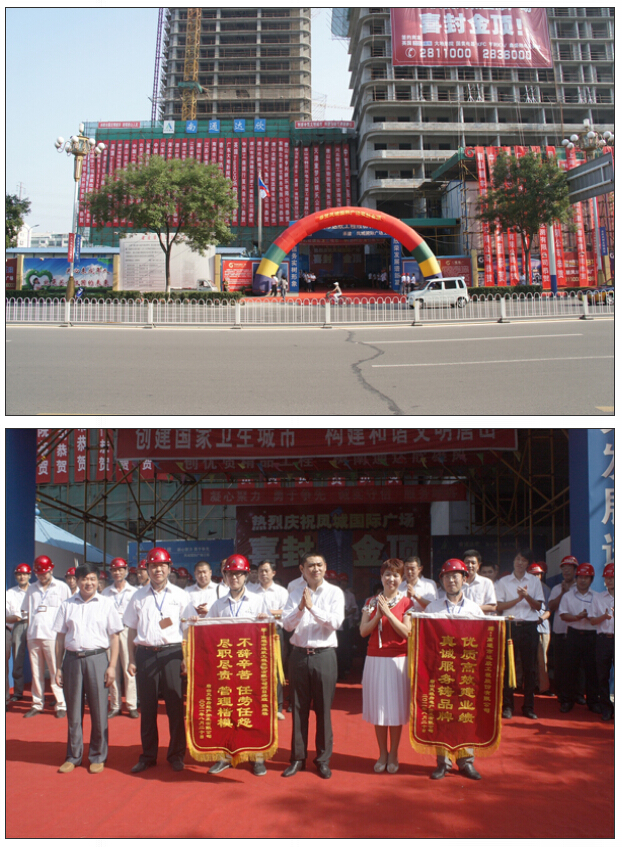 封頂儀式上,天壤地產(chǎn)闞春鳳董事長(zhǎng)、魯寧總經(jīng)理向項(xiàng)目施工單位、合作單位對(duì)于本項(xiàng)目的支持配合及付出的辛勤勞動(dòng)表示了誠(chéng)摯的感謝,給達(dá)欣公司頒發(fā)了“優(yōu)質(zhì)高效建業(yè)績(jī),真誠(chéng)服務(wù)鑄品牌”的錦旗,給項(xiàng)目經(jīng)理張維琪頒發(fā)了“不辭辛苦、任勞任怨,盡職盡責(zé)、管理楷模”的錦旗,以肯定和表彰我公司在鳳城國(guó)際廣場(chǎng)工程施工中所做出的成績(jī)。同時(shí)也希望大家繼續(xù)發(fā)揚(yáng)拼搏創(chuàng)新的精神,為天壤的發(fā)展和唐山的經(jīng)濟(jì)建設(shè)做出貢獻(xiàn)。