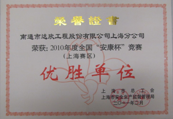 會(huì)上還對(duì)“安康杯”競(jìng)賽活動(dòng)的先進(jìn)集體與個(gè)人進(jìn)行了表彰。第一工程公司“安康杯”競(jìng)賽活動(dòng)工作的有效開(kāi)展,得到了上海市總工會(huì)、上海市安全生產(chǎn)監(jiān)督管理局、上海市建交委、江蘇省駐滬辦的充分肯定,為此被評(píng)為2010年全國(guó)“安康杯”競(jìng)賽(上海賽區(qū))優(yōu)勝單位(受此表彰的外省市進(jìn)滬施工企業(yè)僅此三家),這也是第一工程公司連續(xù)三年獲此榮譽(yù)。