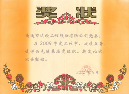 2010年公司成立黨委,在新一屆黨委的領(lǐng)導(dǎo)下,公司全體黨員積極開展創(chuàng)先爭優(yōu)活動,以“腳手架上黨旗揚”為主題,將支部建在項目上,做到“關(guān)鍵崗位有黨員、困難面前有黨員、突擊攻關(guān)有黨員,黨員帶頭技改創(chuàng)新、帶頭攻堅克難、帶頭建功立業(yè)”,充分發(fā)揮黨、團、工會組織在施工生產(chǎn)和經(jīng)濟建設(shè)中的先鋒堡壘作用,促進(jìn)企業(yè)和諧發(fā)展。公司劉厚純、馬和軍、徐仁忠、徐桂壽等4人被海安工業(yè)園區(qū)黨委、胡集鎮(zhèn)黨委評為優(yōu)秀共產(chǎn)黨員。