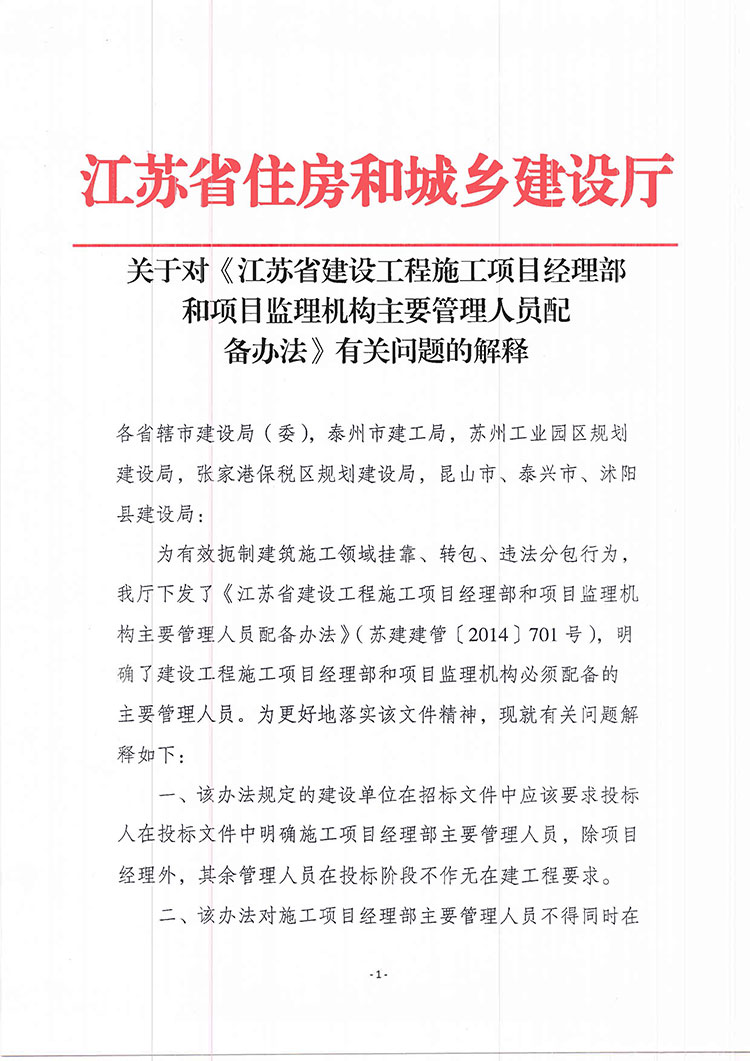 附件:關(guān)于對《江蘇省建設(shè)工程施工項(xiàng)目經(jīng)理部和項(xiàng)目監(jiān)理機(jī)構(gòu)主要管理人員配備辦法》有關(guān)問題的解釋