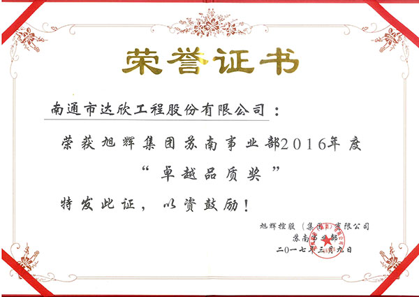 會上,公布了2016年度蘇南旭輝供應(yīng)商評選結(jié)果,公司有幸被評選為蘇南旭輝“卓越品質(zhì)獎”,這是公司首次獲此殊榮,同時也是此次春茗會上中唯一獲此殊榮的建筑企業(yè)。