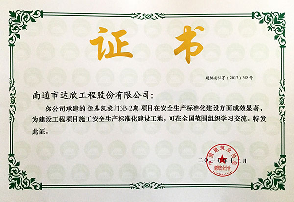 近幾年,我公司獲得全國AAA級安全文明標(biāo)準(zhǔn)化工地25項(xiàng),創(chuàng)建面涉及上海、江蘇、河北、黑龍江、湖南、新疆等市場,榮譽(yù)的取得為進(jìn)一步提升“達(dá)欣”在全國各個(gè)市場的影響力,促進(jìn)企業(yè)健康發(fā)展奠定堅(jiān)實(shí)的品牌基礎(chǔ)。