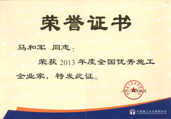 中國(guó)施工企業(yè)管理協(xié)會(huì)于今年2月發(fā)出召開“2014年全國(guó)施工企業(yè)領(lǐng)軍人物峰會(huì)”的通知,根據(jù)通知要求,嚴(yán)格按照“全國(guó)優(yōu)秀施工企業(yè)家”條件在全國(guó)范圍內(nèi)優(yōu)選參會(huì)代表。經(jīng)申請(qǐng)、推薦、審核、公示,中國(guó)施工企業(yè)管理協(xié)會(huì)企業(yè)家工作委員會(huì)審定,確定166位企業(yè)領(lǐng)導(dǎo)為“2014年全國(guó)施工企業(yè)領(lǐng)軍人物峰會(huì)”參會(huì)人選并授予“全國(guó)優(yōu)秀施工企業(yè)家”榮譽(yù)稱號(hào)。公司董事長(zhǎng)馬和軍榮列榜單之中。
