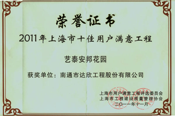 上海市“十佳用戶滿意工程”是上海市建筑業(yè)重量級獎項,是上海市在建的大型工程中,通過業(yè)主等部門使用后,選出十五項質(zhì)量優(yōu)秀、后期運行穩(wěn)定、服務(wù)質(zhì)量優(yōu)秀的工程為候選單位,并在十五項候選工程中選出十項通過專家評審,方可獲得上海市“十佳用戶滿意工程”獎。獲此獎項標(biāo)志著達(dá)欣公司進滬施工的信譽和業(yè)績提高到了一個更高層次,必將對持續(xù)經(jīng)營開發(fā)起到良好的社會影響。