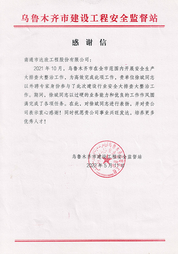 6月8日,集團收到一封來自烏魯木齊市建設工程安全監(jiān)督站的感謝信,詳細內容如下:
