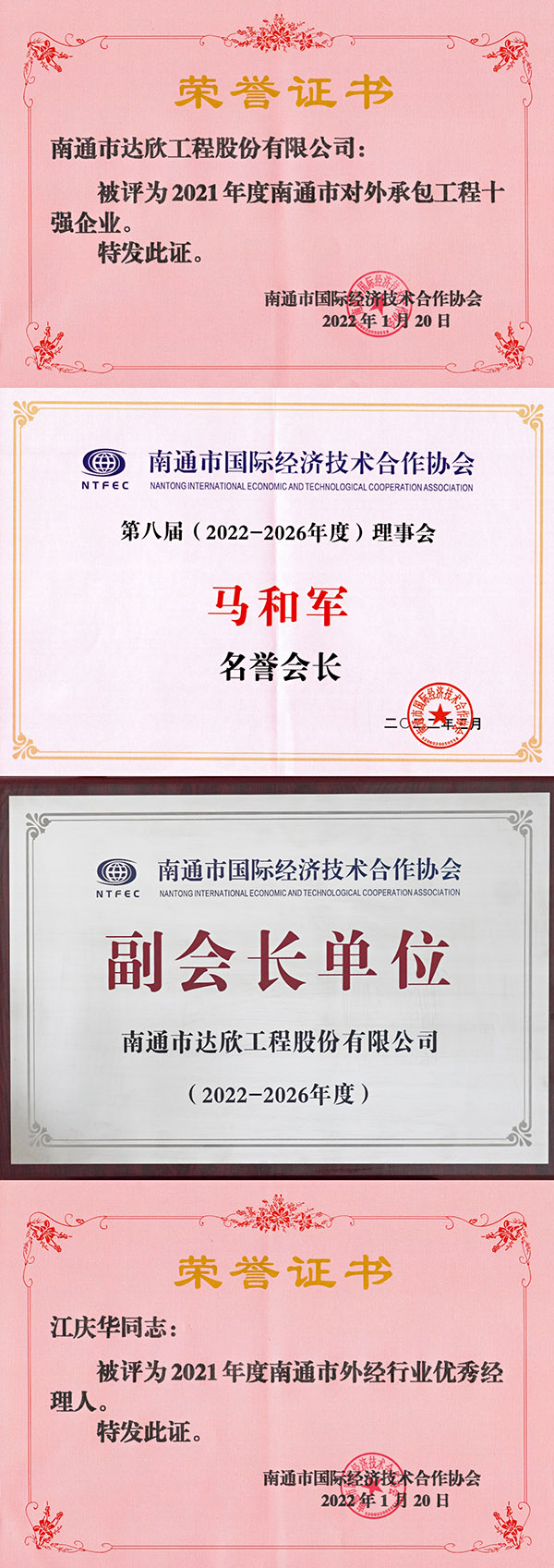 會(huì)上,達(dá)欣集團(tuán)被評為2021年度南通市對外承包工程十強(qiáng)企業(yè),董事長馬和軍當(dāng)選第八屆(2022-2026年度)理事會(huì)名譽(yù)會(huì)長,企業(yè)當(dāng)選為副會(huì)長單位,柬埔寨分公司江慶華被評為南通市外經(jīng)行業(yè)優(yōu)秀經(jīng)理人。