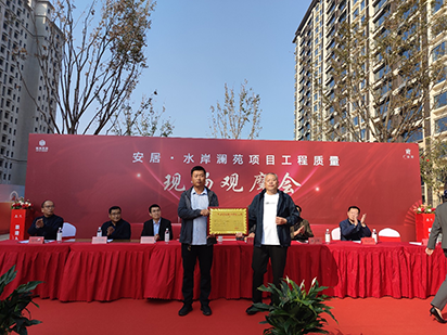 10月19日,第三工程公司承建的安居?水岸瀾苑項目工程質(zhì)量現(xiàn)場觀摩會暨廣平縣2023年度建設質(zhì)量樣板工程頒獎儀式隆重舉行。邯鄲市建筑工程質(zhì)量管理站副站長徐金峰、張少軍科長、廣平縣建筑工程質(zhì)量監(jiān)督站,廣平縣在建工程各施工單、監(jiān)理單位、地產(chǎn)開發(fā)商代表等120余人參加活動。安居?水岸瀾苑項目經(jīng)理吉光代表公司接受“2023年度建設質(zhì)量樣板工程”獎牌。