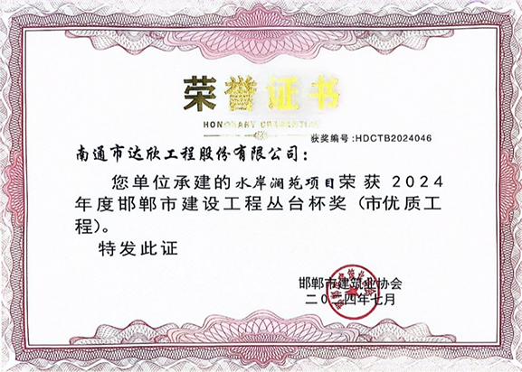 日前,從邯鄲市建筑業(yè)協(xié)會(huì)獲悉,水岸瀾苑項(xiàng)目獲邯鄲市2024年度優(yōu)質(zhì)工程---“叢臺(tái)杯”工程。