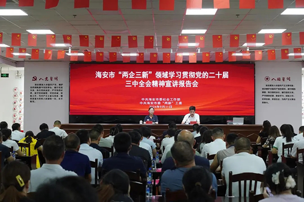 為全面深入學(xué)習(xí)宣傳貫徹黨的二十屆三中全會(huì)精神,激發(fā)黨員干事創(chuàng)業(yè)的熱情,9月11日,集團(tuán)黨委以海安市召開的“兩企三新”領(lǐng)域?qū)W習(xí)貫徹黨的二十屆三中全會(huì)精神宣講報(bào)告會(huì)為契機(jī)組織黨員集中學(xué)習(xí),集團(tuán)副董事長、總經(jīng)理王邦國,黨委副書記、副董事長、紀(jì)委書記楊靜以及集團(tuán)在海黨員參與線下現(xiàn)場教學(xué),各駐外黨支部黨員以視頻會(huì)議的形式進(jìn)行遠(yuǎn)程參學(xué)。