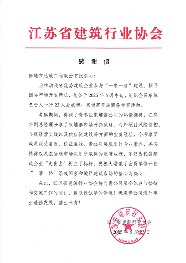 6月23日,集團(tuán)收到來(lái)自江蘇省建筑行業(yè)協(xié)會(huì)的感謝信。信中對(duì)集團(tuán)柬埔寨公司在省協(xié)會(huì)組織會(huì)員單位赴柬埔寨商務(wù)考察期間,以專業(yè)實(shí)力與豐富的實(shí)踐為考察團(tuán)提供有益的幫助,特此專函致謝。