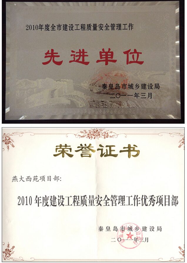 2011年3月8日,秦皇島市城鄉(xiāng)建設(shè)局召開2010年度全市建設(shè)工程質(zhì)量安全管理工作先進單位和先進個人表彰大會:第三工程公司獲2010年度秦皇島市建設(shè)工程質(zhì)量安全管理工作先進單位;燕大西苑三標段項目部獲優(yōu)秀項目部;燕大西苑三標段項目經(jīng)理楊禮虎獲優(yōu)秀項目經(jīng)理。